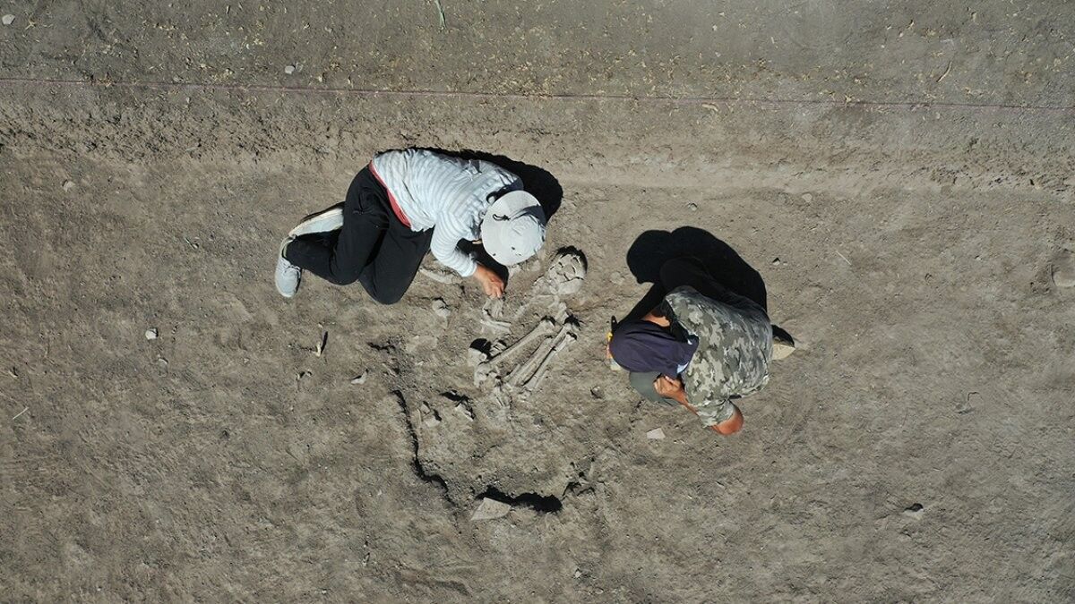 "Saptamış olduğumuz bu iskelet, erişkin olduğunu tahmin ettiğimiz bir bireye ait. Geç neolitik döneme dair bir mezar olması bakımından bizim için önemli çünkü biz 2014 yılından bu yana kazdığımız hiçbir alanda böylesi bir mezarla karşılaşmamıştık. Basit bir toprak gömü şeklinde karşınıza çıkıyor. Şu ana kadar henüz bir arkeolojik bir bulgu yanında yok. Arkeolojide hocker dediğimiz tarzda gömülmüş. Yön olarak baktığımızda kuzeydoğu-güneybatı istikametinde görülüyor ama yine ölü gömme ile ilgili bizim için son derece değerli olan bir başka bulgu da yanında küçükbaş hayvanlara ait kemiklerin olmasıdır. Bu da ölü yemeğinin varlığına işaret etmekte; yani ölümünden sonra geride kalanların bir ölü yemeği düzenlediğini ve arta kalan kemikleri düzenli bir şekilde mezarın içerisine bıraktığını gösteriyor ki bu da sonraları özellikle Anadolu ve Yakın Doğu'da pek çok yerde gördüğümüz geleneğin erken örneklerinden birisi olarak karşımıza çıkıyor."