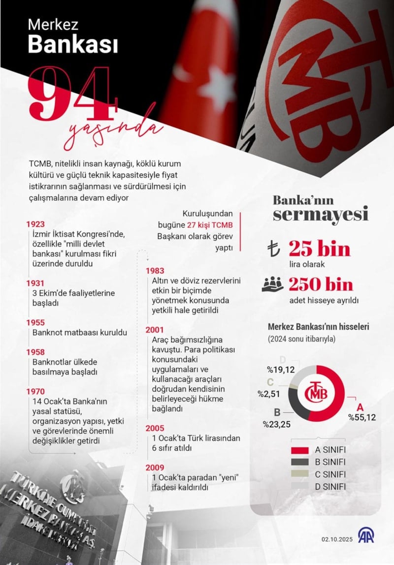 Farklı kurum ve kuruluşlar tarafından yürütülen işlevlerin tek elde toplanmasının ardından 3 Ekim 1931'de faaliyetlerine başlayan Merkez Bankası, 94. yıl dönümünü kutluyor.