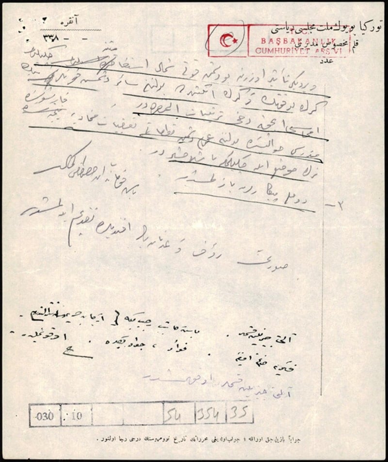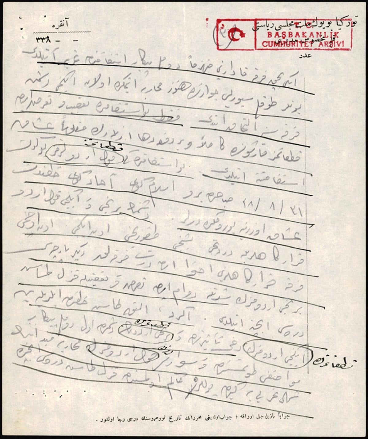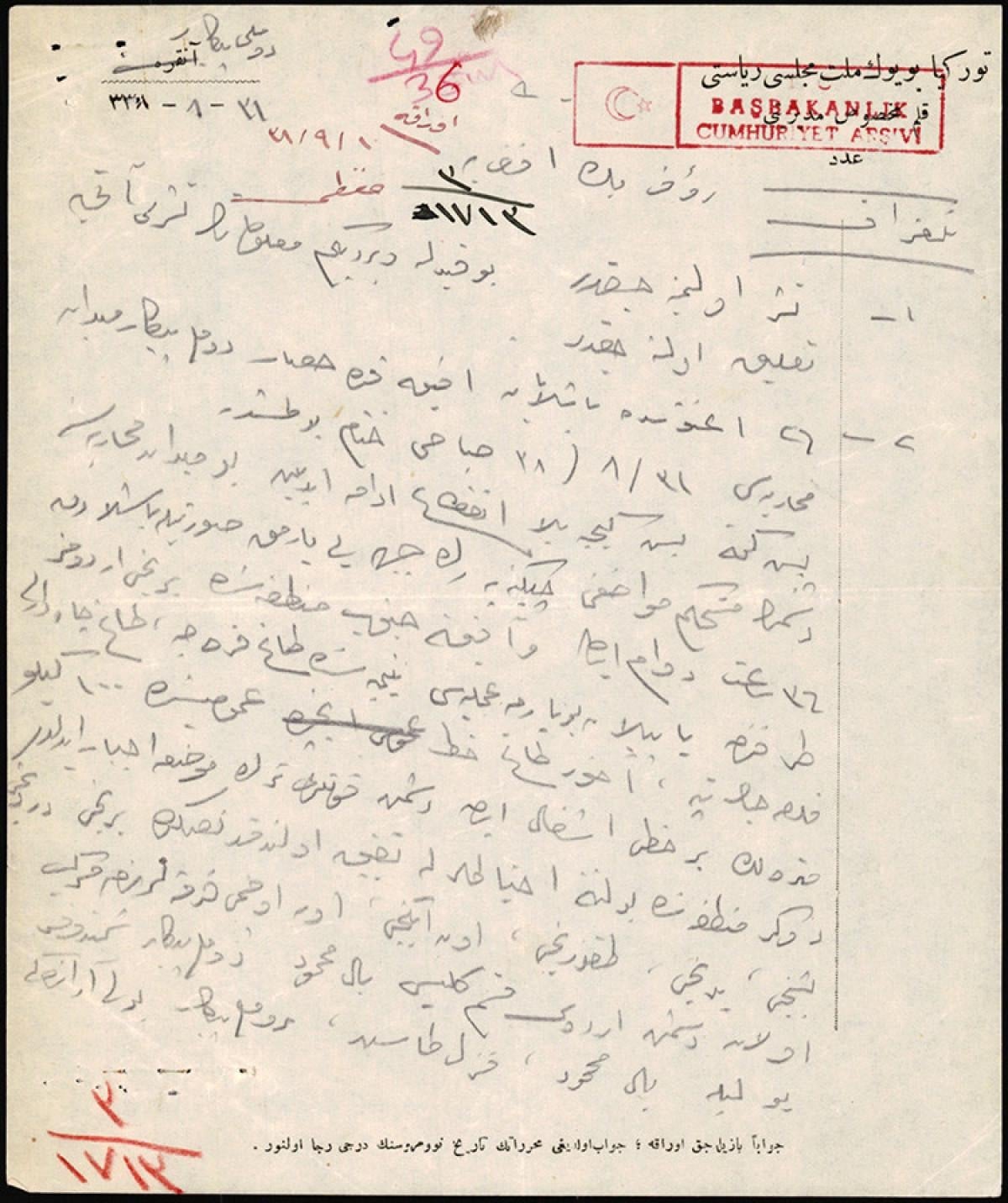 Cumhurbaşkanlığı Devlet Arşivleri Başkanlığında özenle muhafaza edilen Başkumandan Mustafa Kemal Paşa'nın Rauf Bey'e gönderdiği telgrafın başında şu bilgiler aktarılıyor: