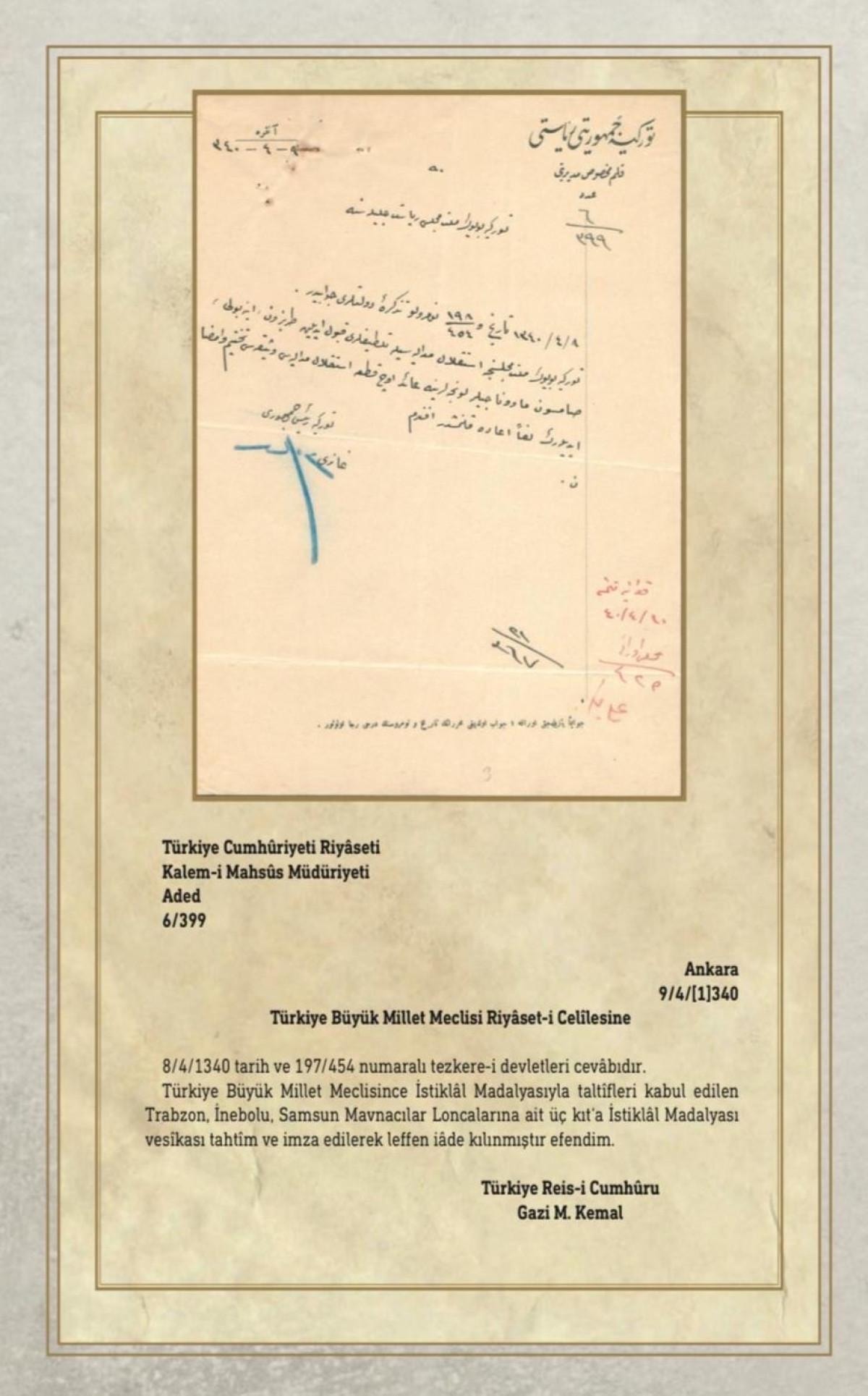Madalya sürecine ilişkin bilgi veren Karaismailoğlu, “1924’te Meclis kararıyla Trabzon Kayıkçı Loncası’na verilen madalya ve berat, resmî olarak teslim edilememişti. 101 yıl sonra konuyu titizlikle ele aldık, arşivlerdeki belgelerle kararın tüm detaylarını ortaya çıkardık. TBMM kayıtları tek tek incelendi, Milli Savunma Bakanlığımızın onayı alındı. Madalya ve berat, gereği yapılmak üzere TBMM’ye gönderildi” dedi.