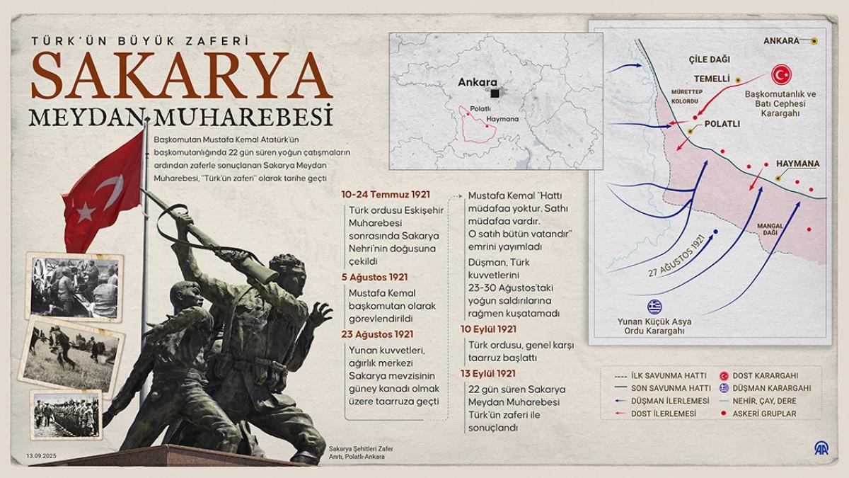 Başkomutan Mustafa Kemal Atatürk'ün başkomutanlığında 22 gün süren yoğun çatışmaların ardından zaferle sonuçlanan Sakarya Meydan Muharebesi, "Türk'ün zaferi" olarak tarihe geçti.