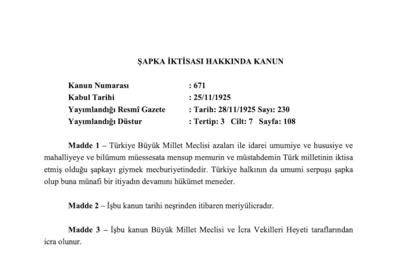 Dönemin hükümetleri, şapka ve tesettürle ilgili de radikal kararlar almıştı. Şapka Kanunu (1925) ile sarık ve cübbe giymek sadece “yüksek rütbeli din görevlilerine” (Pratikte sadece Diyanet İşleri Başkanı’na) hasredilmiş, sokakta sarık takıp, cübbe giymek yasaklanmıştı. Kanunla aslında sadece devlet memurlarına şapka takma zorunluluğu getirilmişse de bu dayatma sade vatandaşlara da şamil kılınmıştı. Yasa metninde kadınların tesettürüne dair net bir ifade olmamakla birlikte, CHP’li valiler ile belediye başkanları, kadınların peçe ve çarşaflarını çıkartmak için kamu otoritesinin gücünü kullanarak cezai müeyyideler getirmişlerdi. Zaman zaman da “modernleşme kampanyaları” yürütülmüş, CHP’li kadınlar “çarşaf yırtma, manto dağıtma” etkinlikleri düzenlemişti.