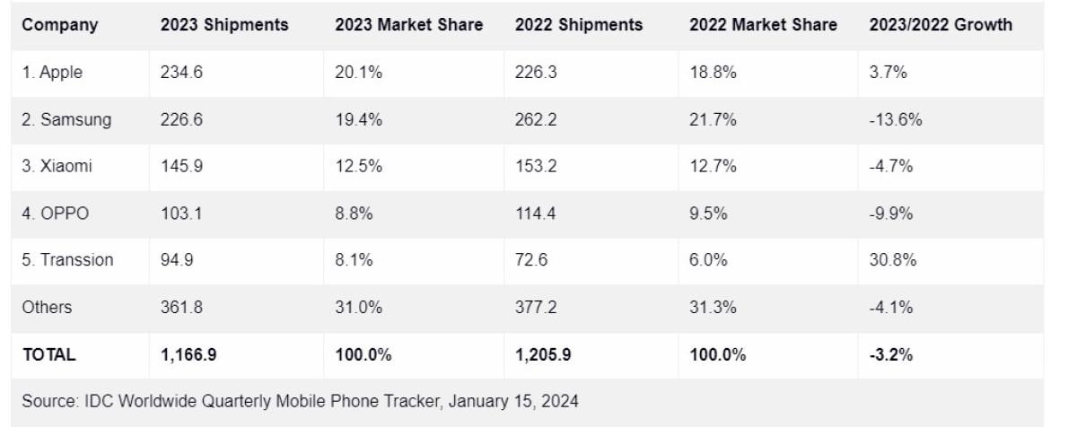 Ancak, bu büyük üçlü arasında yalnızca Apple, yıllık satışlarını artırma başarısını gösterdi. Şirket, 2022'de 226,3 milyon birim olan sevkiyatlarını geçen yıl 234,6 milyon birime çıkarmayı başardı.