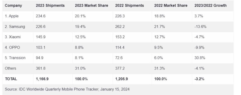 IDC, 2023 yılında küresel akıllı telefon satış verilerini paylaştı. Apple, 13 yıl sonra ilk defa Samsung'dan daha fazla telefon satmayı başardı.