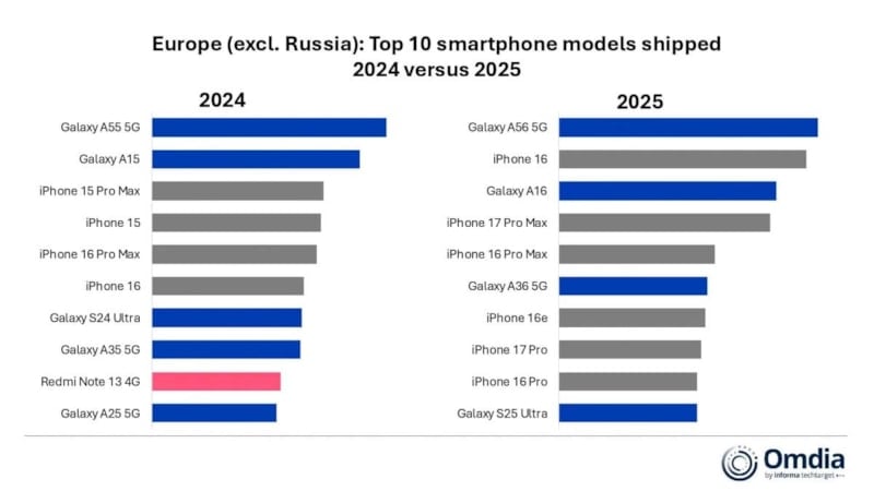 Samsung, 2025 yılında Avrupa akıllı telefon pazarında liderliğini korurken Galaxy A56 modeli, tüm iPhone'ları geride bırakarak bölgenin en çok satan telefonu olmayı başardı.