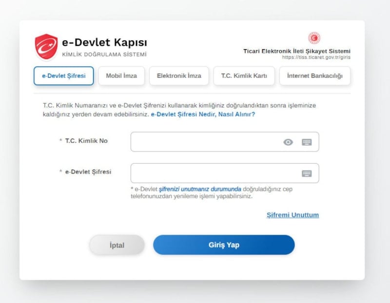 1- tiss.ticaret.gov.tr adresine gidin ve e-Devlet hesabınızla sisteme giriş yapın.