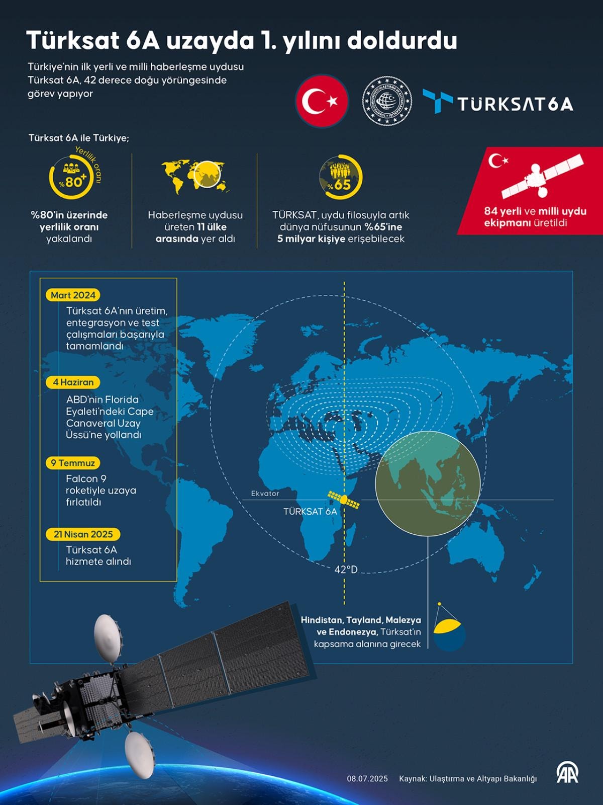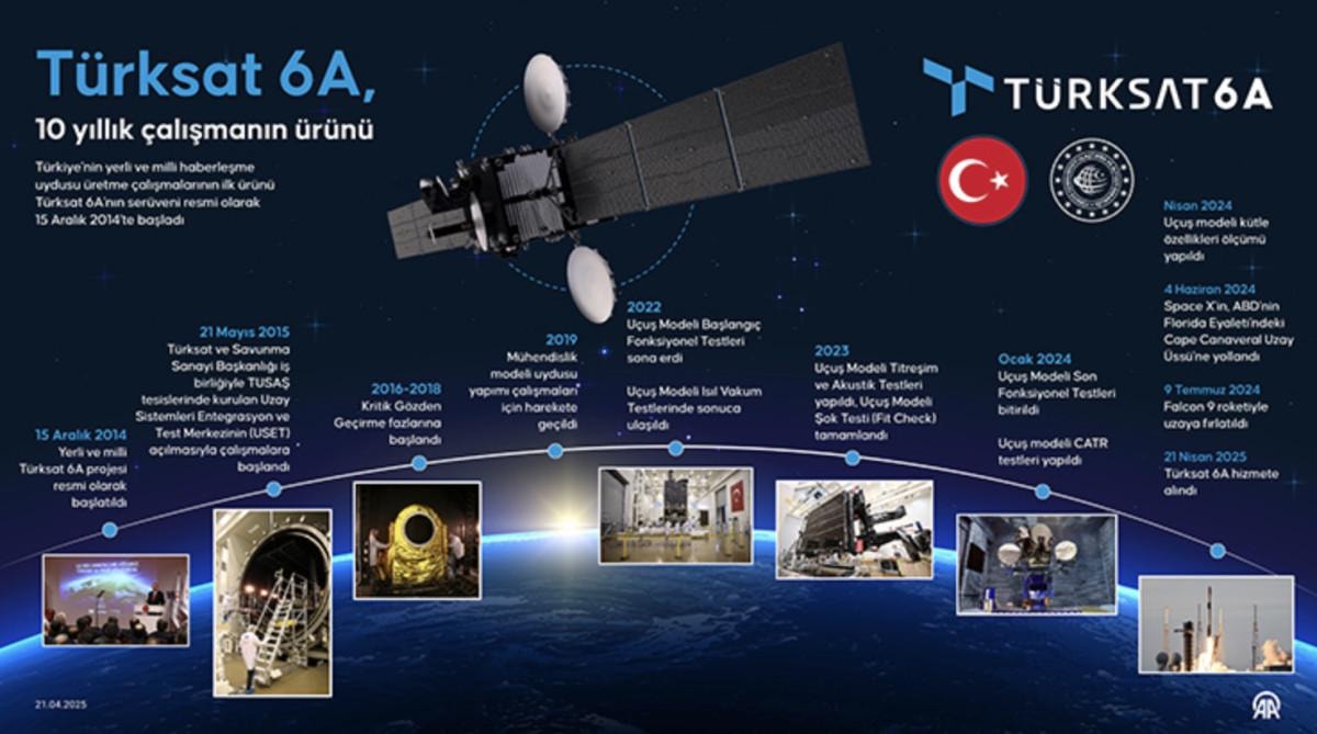 Uraloğlu, Türksat 6A'nın üretiminin ve testlerinin tamamlanmasının ardından 4 Haziran 2024'te yörüngesine fırlatılması için ABD'nin Florida Eyaleti'ndeki Cape Canaveral Uzay Üssü'ndeki Space X tesislerine yolladıklarını hatırlatarak, uyduyu 9 Temmuz 2024'te de uzaya fırlattıklarını belirtti.