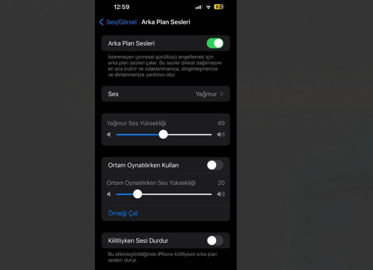 Ayarlar > Erişilebilirlik > Ses /görsel > Arka Plan Sesleri'ne gitmeniz yeterli. Burada, uyumanız gerektiğinde manuel olarak tetikleyebileceğiniz, dengeli gürültü, parlak gürültü, yağmur, okyanus ve akıntıyı içeren bir menü bulacaksınız.