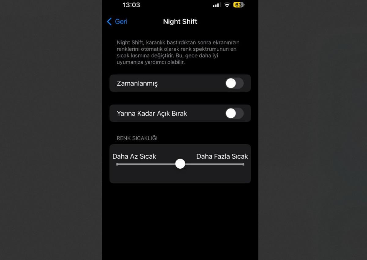 Telefonunuzun ekranını sarı ışığa doğru kaydıracak şekilde programlayabilir veya manuel olarak açabilirsiniz: Ayrıca, uyanmaya hazır olduğunuzda bu modun devre dışı kalması için bir bitiş zamanı da ayarlayabilirsiniz.