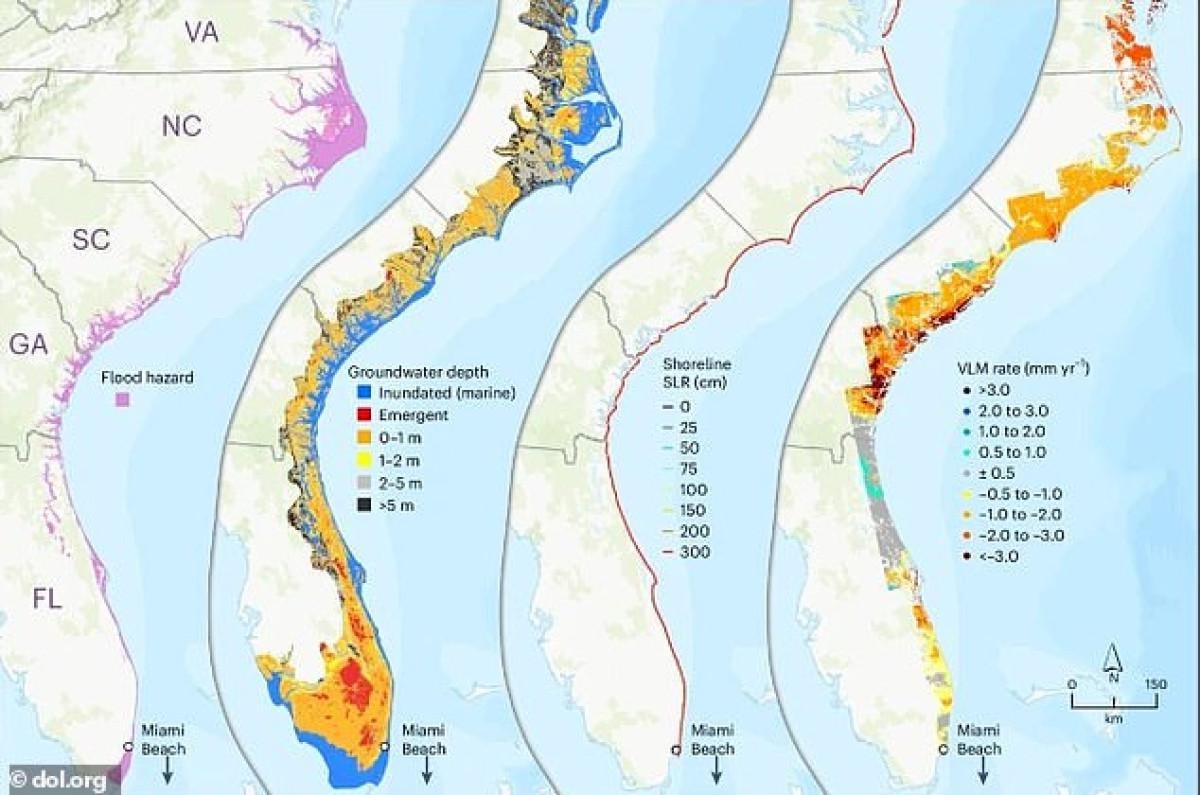 ABD Jeoloji Araştırmaları Kurumu (USGS) araştırmacıları, 2100 yılına gelindiğinde ABD Doğu Sahili'nin; yükselen deniz seviyeleri, su baskınları ve batan topraklar nedeniyle ciddi şekilde etkileneceğini öngörüyor.