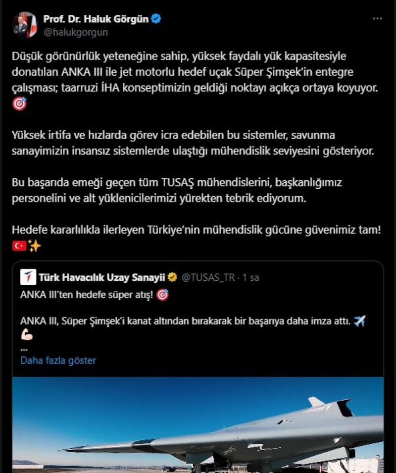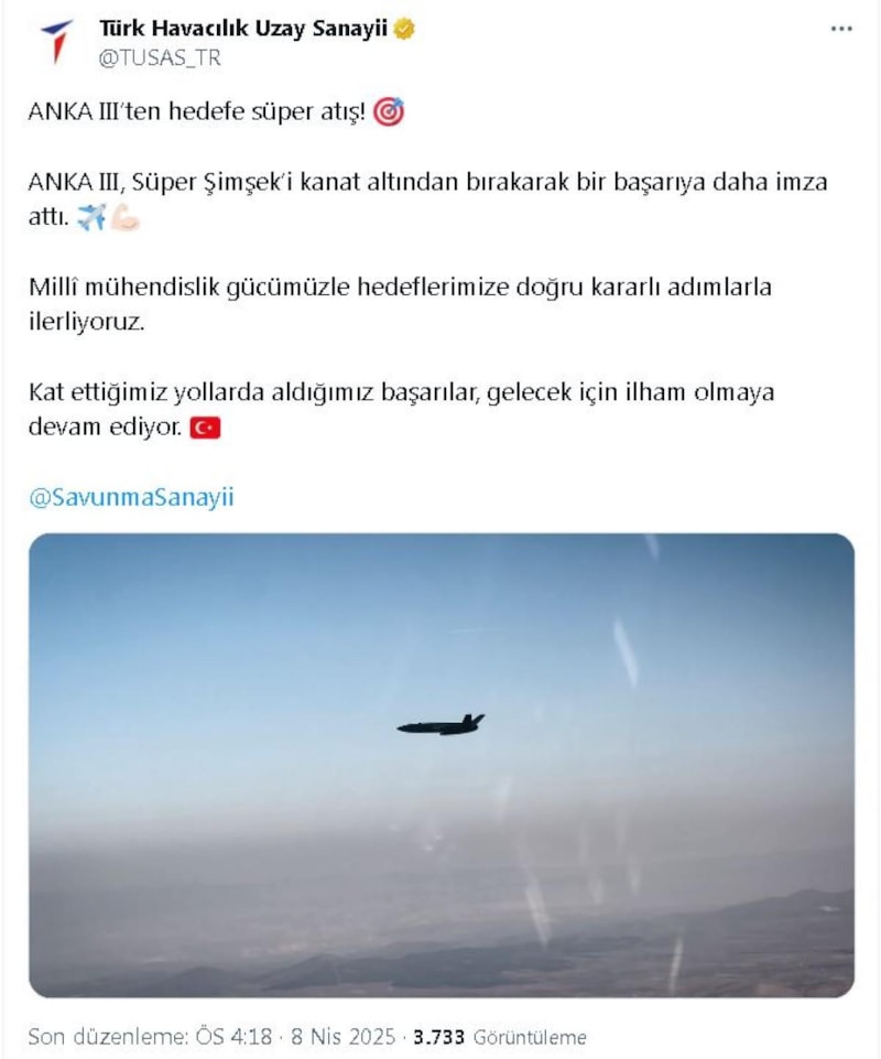 TUSAŞ, paylaşılan görüntülere ek olarak, "ANKA 3’ten hedefe süper atış! ANKA 3, Süper Şimşek’i kanat altından bırakarak bir başarıya daha imza attı. Milli mühendislik gücümüzle hedeflerimize doğru kararlı adımlarla ilerliyoruz. Geride bıraktığımız başarılar, geleceğe dair umut verici bir ilham kaynağı olmaya devam ediyor." ifadelerini kullandı.