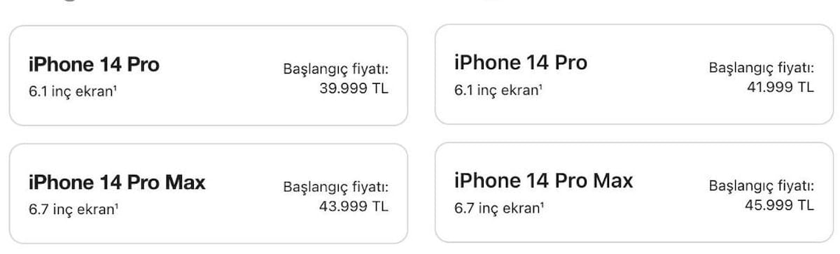 Böylece iPhone 14 30,999 TL'den 32,999 TL'ye, iPhone 14 Pro 39,999 TL'den 41,999 TL'ye, iPhone 14 Plus 34,999 TL'den 36,999 TL'ye ve iPhone 14 Pro Max 43,999 TL'den 45,999 TL'ye yükseldi.