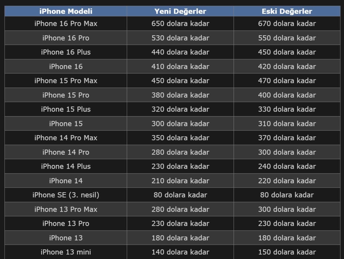 - iPhone 16 Pro Max'ın değeri 670 dolardan 650 dolara, diğer modellerin ise 10-20 dolar arasında düşük değerlere piyasaya sunuldu.
