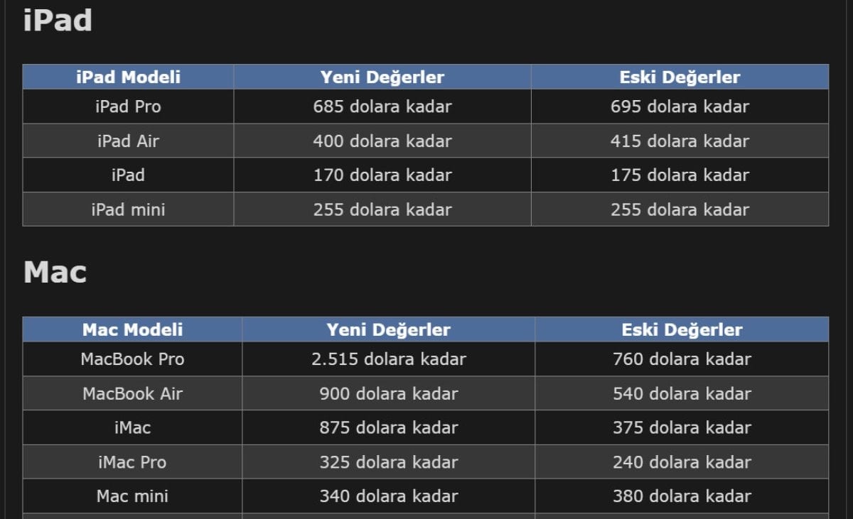 - Apple, ABD'de iPhone, iPad, Mac ve Apple Watch modellerinin takas değerlerini düşürdü.