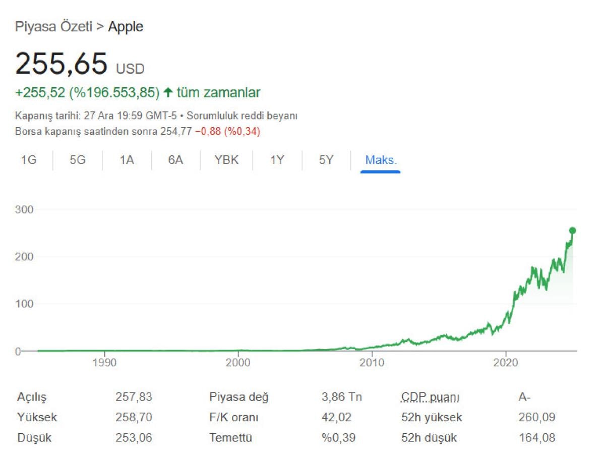 Apple, Aralık 1980'de 22 dolardan halka arz edilmişti. Hisse bölünmeleri hesaba katıldığında, halka arzda 1.000 dolarlık Apple hissesi alan birinin bugünkü hisselerinin değeri 2 milyon 576 bin 952 dolar olacaktı.