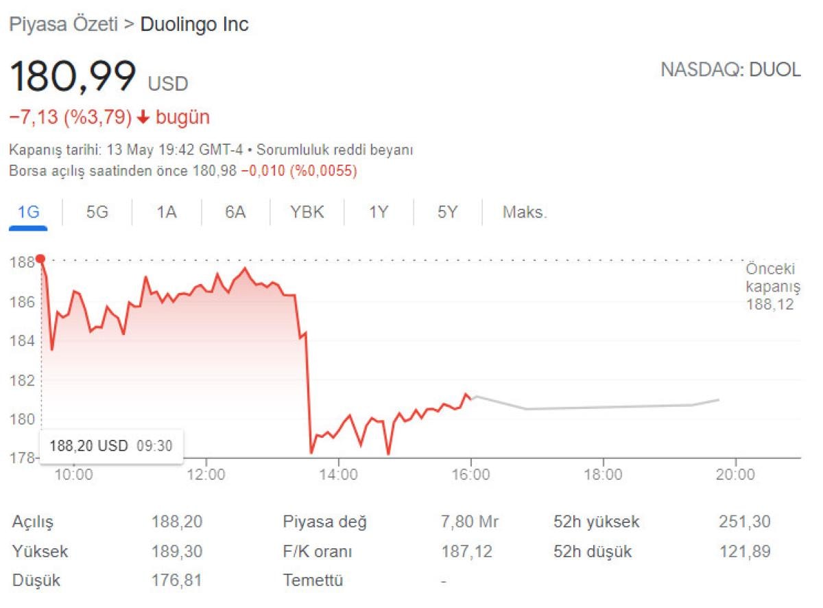 Daha birkaç gün önce 250 dolar seviyelerinden işlem göre Duolingo hisseleri, dün akşam yapılan açıklama ile 177 dolar seviyelerine kadar geriledi.
