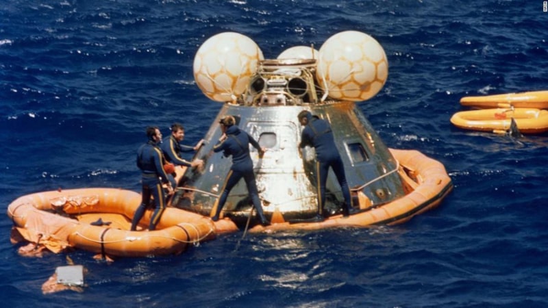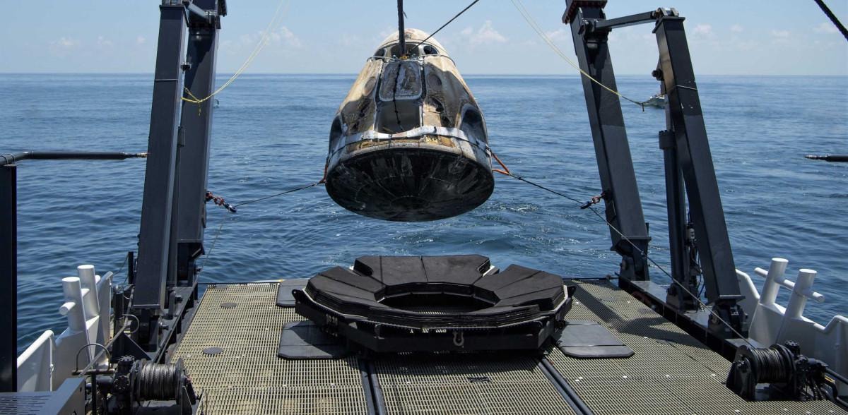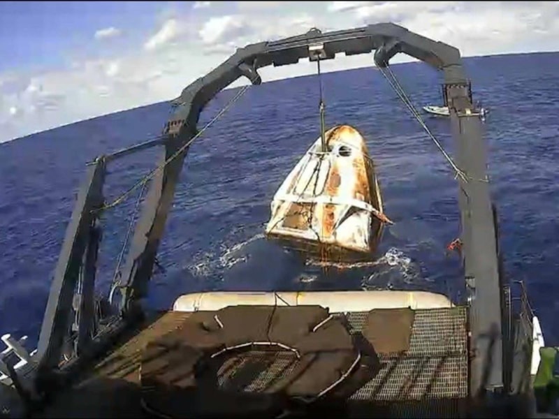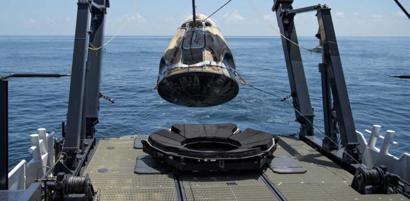 İnişin güvenli şekilde tamamlanmasının ardından kurtarma ekipleri bölgeye gidiyor. Uzay aracı kapsülü, gemiye alınarak girişi açılıyor ve astronotlar kapsülden çıkarılıyor.
