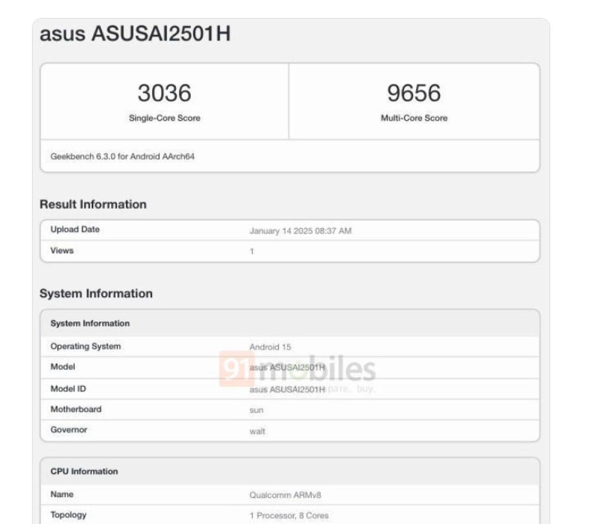 Zenfone 12 Ultra, Snapdragon 8 Elite işlemci, 16 GB RAM ve Android 15 ile Geekbench'te ASUS_AI2501H model numarasıyla listelendi.
