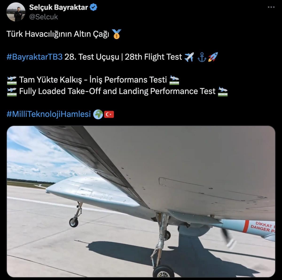 Yapılan açıklamada Bayraktar TB3'ün tam yükte kalkış ve iniş performans testini başarıyla tamamladığı ifade edildi.