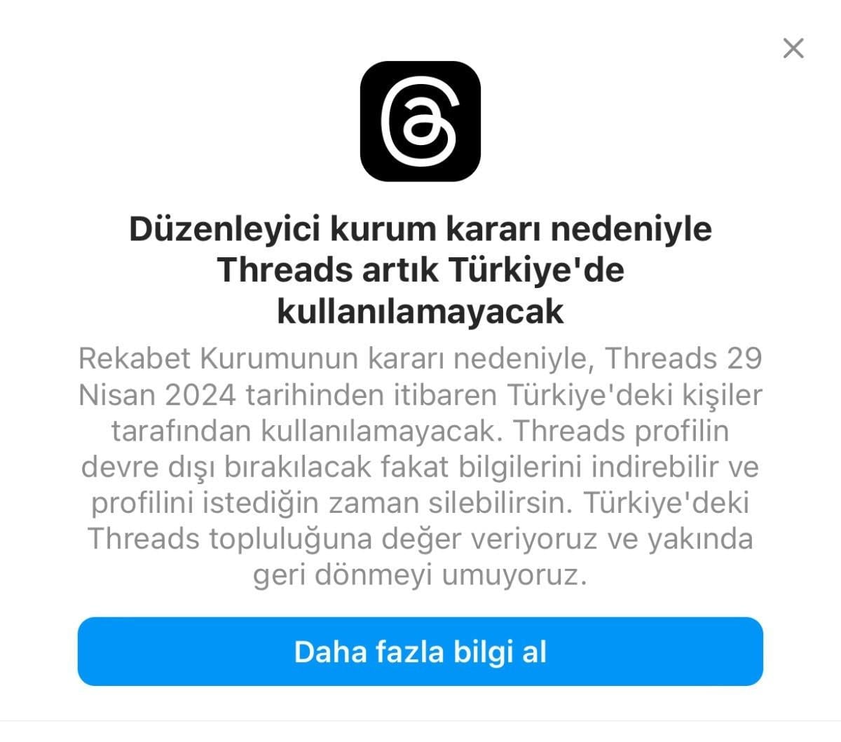 Meta'nın metin tabanlı sosyal medya platformu Threads, Rekabet Kurumu'nun emrine uymak için 29 Nisan'dan itibaren Türkiye'de erişime kapatıldı.