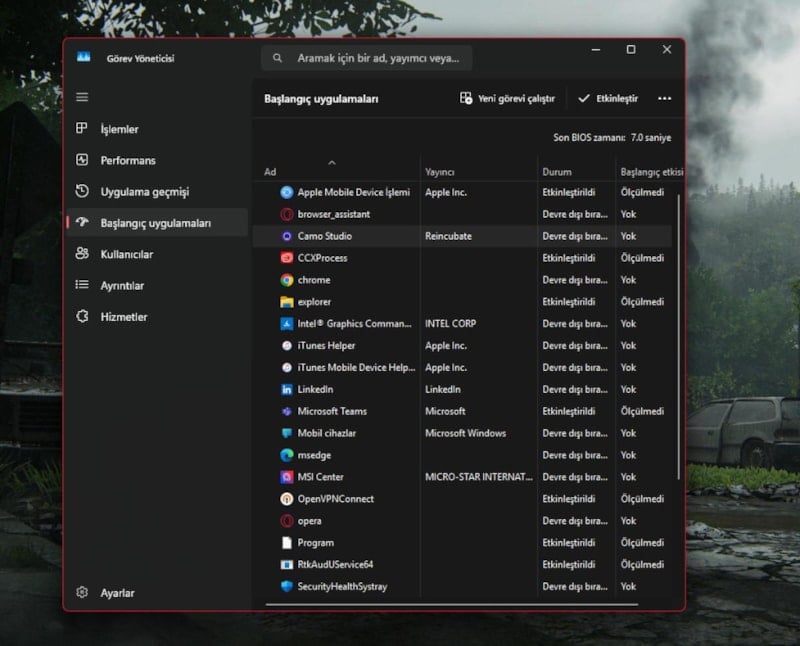 Burada, hangi programların etkin olduğunu görebilir ve gereksiz olanları kolayca devre dışı bırakabilirsiniz.