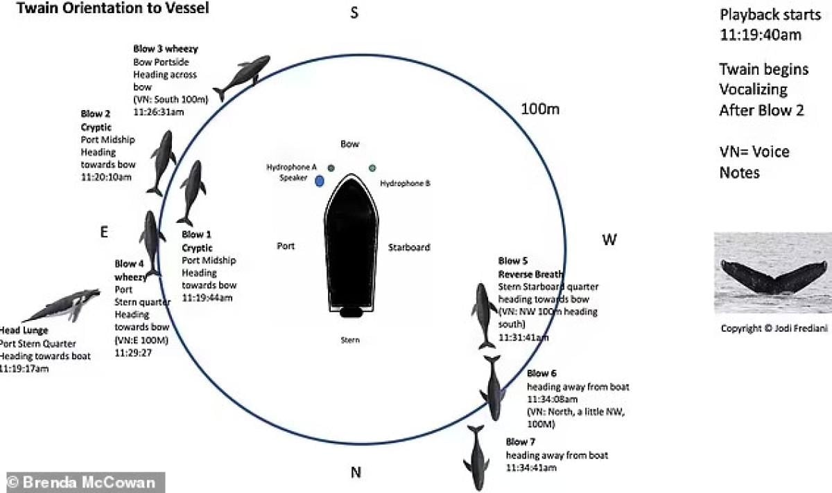 Çağrı suda çalındığında, Twain isimli balina, tekneye yaklaştı ve 20 dakika boyunca kendi selamlama çağrısıyla yanıt verdi.
