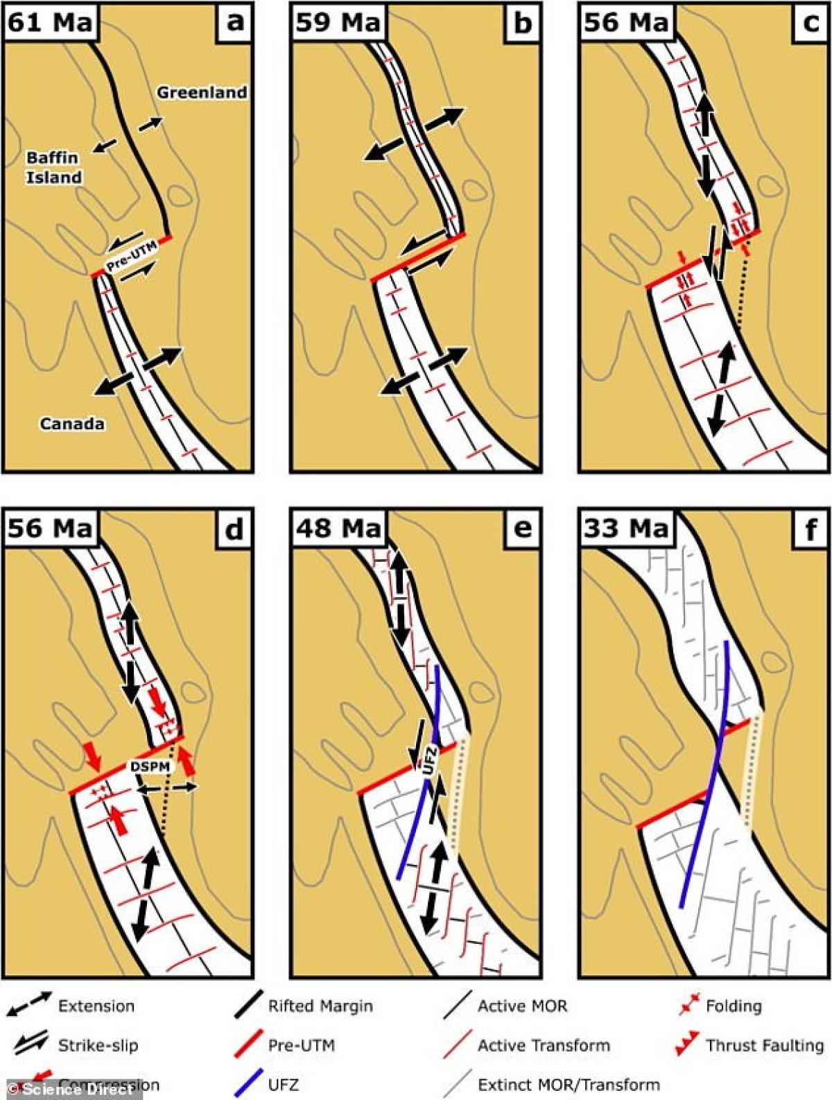 Kanada ile Grönland arasındaki ilk çatlak yaklaşık 118 milyon yıl önce başladı, ancak deniz tabanı bugün Davis Boğazı olarak bilinen şeyi oluşturmak üzere 61 milyon yıl önce yayılmaya başladı.