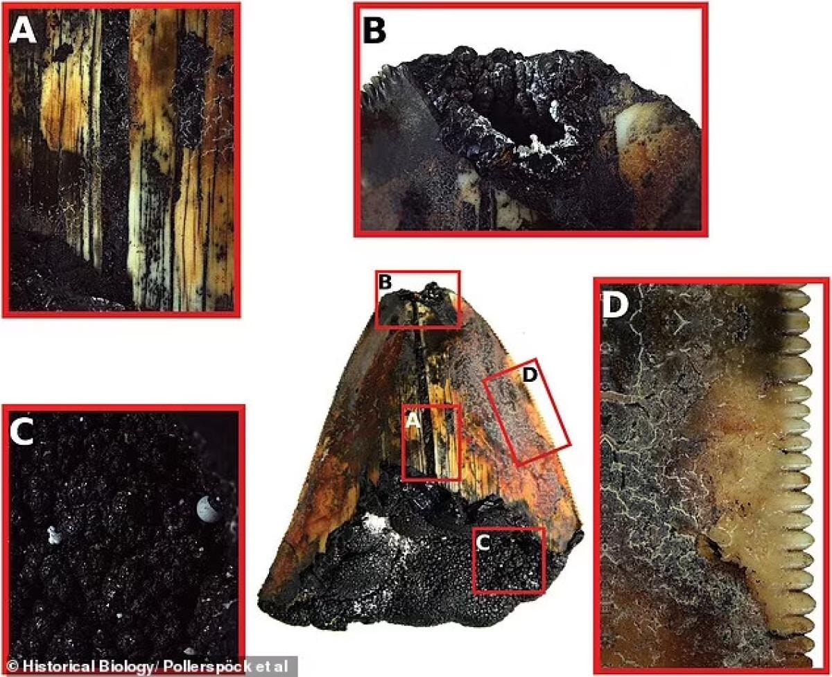 Dişin tırtıklı kesici kenarları hâlâ sağlamdı; bu da onun, bulunmadan önce çevredeki kayalardan ayrılıp okyanusa sürüklenmediğini gösteriyordu.