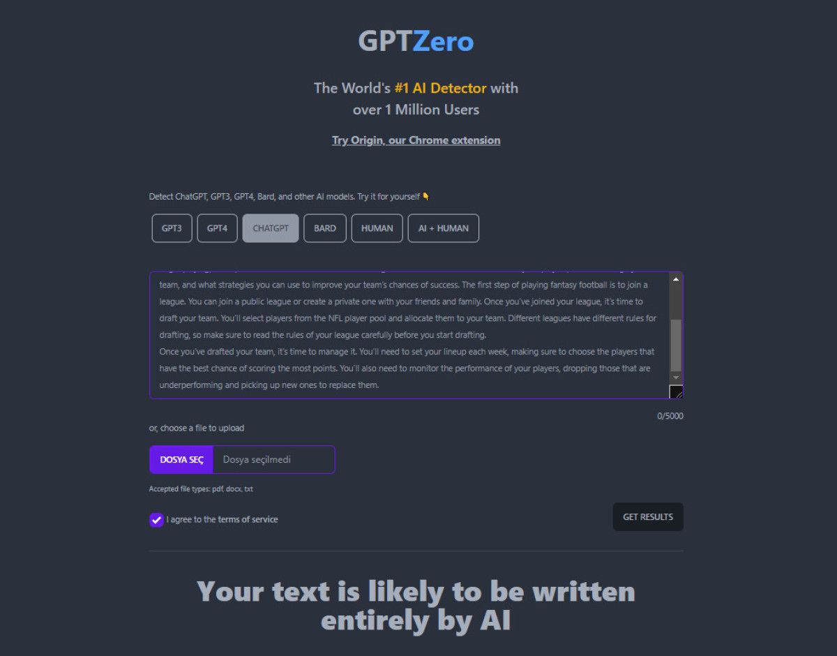 Bir başka yöntem ise, metnin ChatGPT ile yazıldığını tespit edebilen diğer yapay zeka araçlarını kullanmak: GPTZero.
