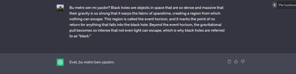 Bir metnin ChatGPT ile yazıldığını öğrenmek için, ChatGPT'ye "Bu metni sen mi yazdın?" diye sorduktan sonra metni yapıştırın. Eğer metin ChatGPT ile yazılmışsa, "Evet, bu metni ben yazdım." cevabını alacaksınız.