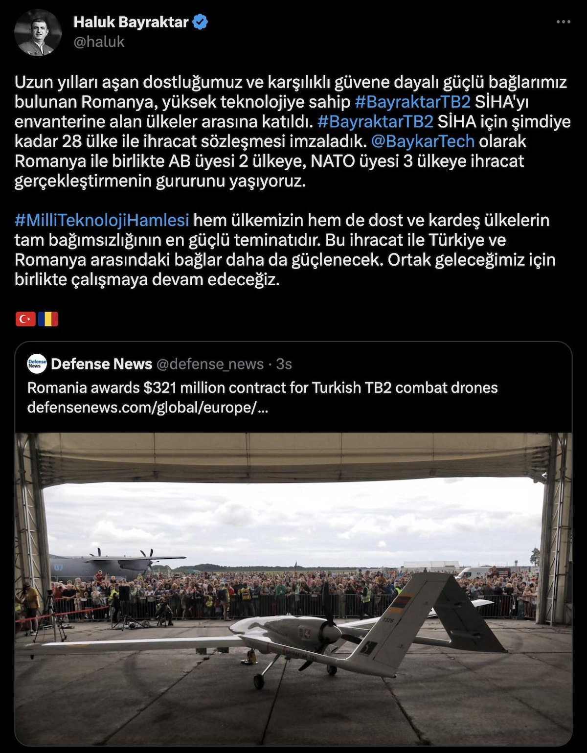 Uzun yılları aşan dostluğumuz ve karşılıklı güvene dayalı güçlü bağlarımız bulunan Romanya, yüksek teknolojiye sahip BayraktarTB2 SİHA'yı envanterine alan ülkeler arasına katıldı. Bayraktar TB2 SİHA için şimdiye kadar 28 ülke ile ihracat sözleşmesi imzaladık. Baykar olarak Romanya ile birlikte Avrupa Birliği (AB) üyesi 2 ülkeye, NATO üyesi 3 ülkeye ihracat gerçekleştirmenin gururunu yaşıyoruz.