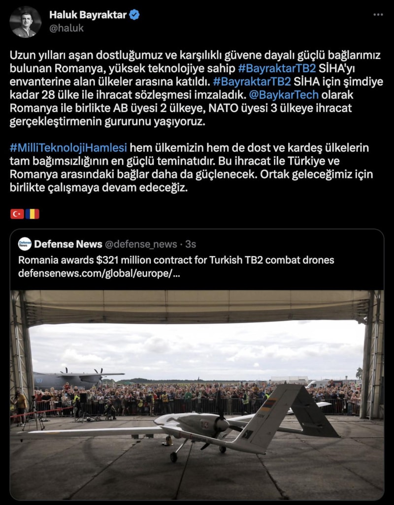 BAYKAR Genel Müdürü Haluk Bayraktar, Twitter hesabından yapılan paylaşımda Romanya'nın Bayraktar TB2 SİHA'yı envanterine alan ülkeler arasına katıldığını açıkladı.