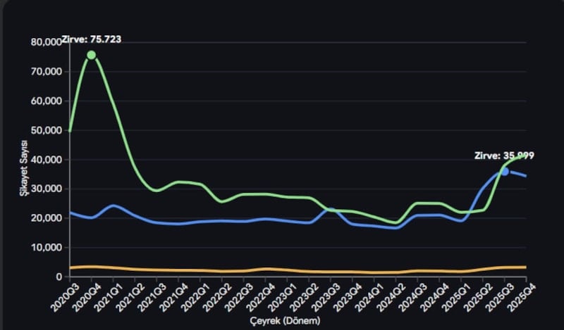 2024 ortalarında 16 bin bandında olan mobil şikayetler, 2025'in son çeyreğinde 34 bin 368'e ulaşarak 41 bin 516 şikayet alan internet servis sağlayıcılarının hemen ensesine yerleşti.
