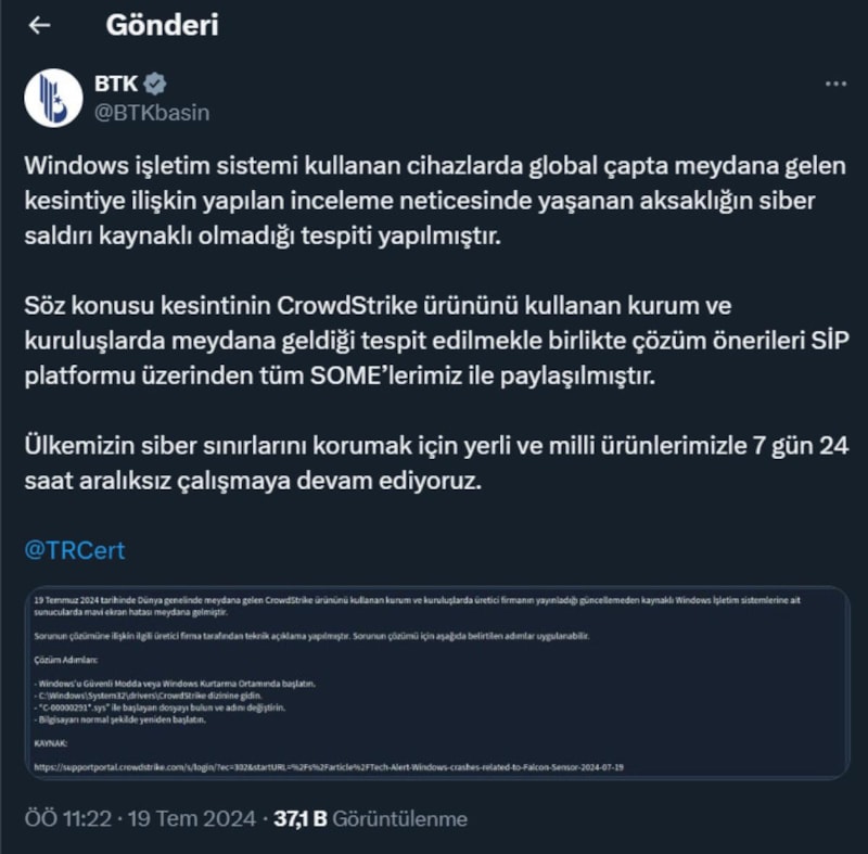 Söz konusu kesintinin CrowdStrike ürününü kullanan kurum ve kuruluşlarda meydana geldiği tespit edilmekle birlikte çözüm önerileri SİP platformu üzerinden tüm SOME’lerimiz ile paylaşılmıştır.