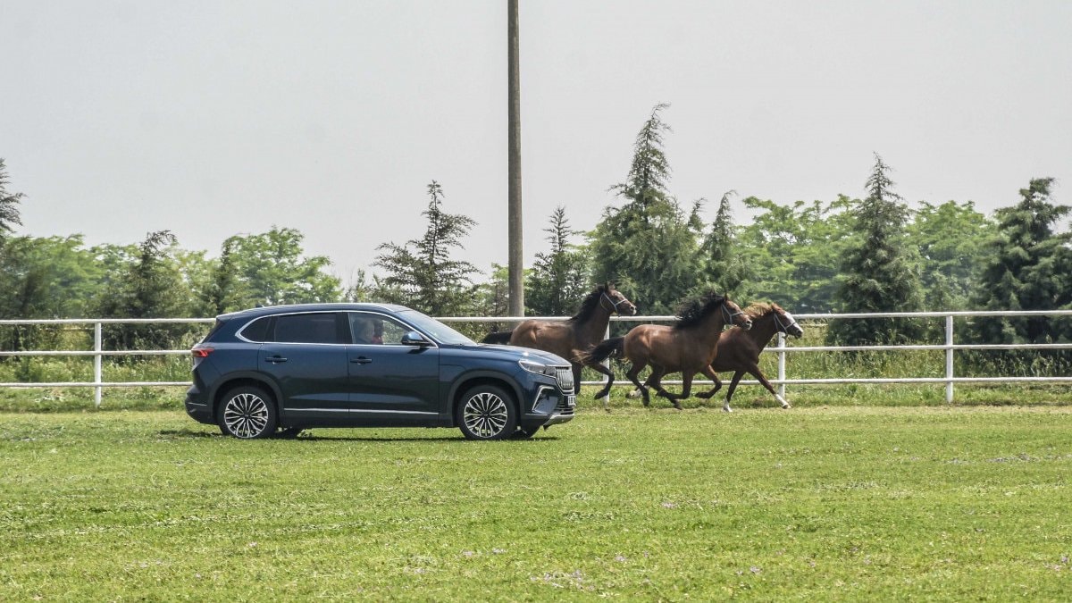 1 numaralı manejdeki safkan yarış atları çim zeminde koşarken, Ali Özkan da toprak yolda Togg’la sürat yaptı.