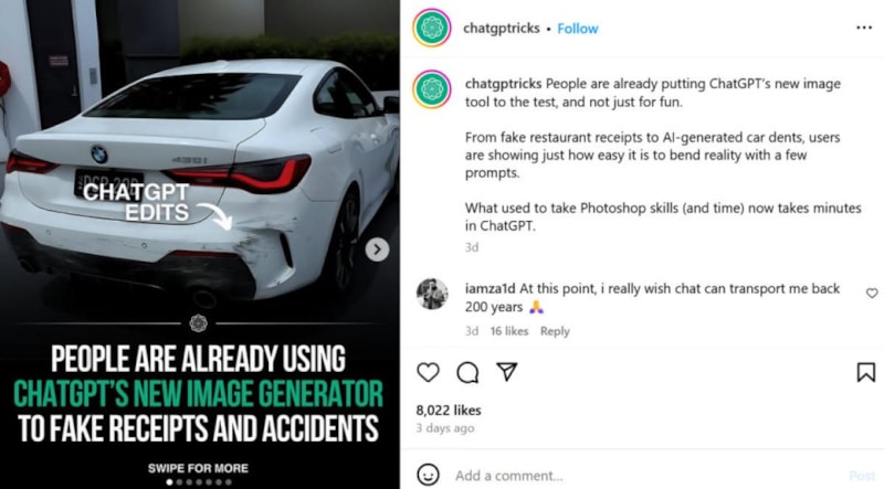 Reddit'in r/chatgptricks adlı alt dizininde viral olan bir gönderide, bir kullanıcı GPT-4o'yu kullanarak arkadan hasarlı bir BMW'nin sahte bir fotoğrafını nasıl oluşturduğunu detaylarıyla anlattı.