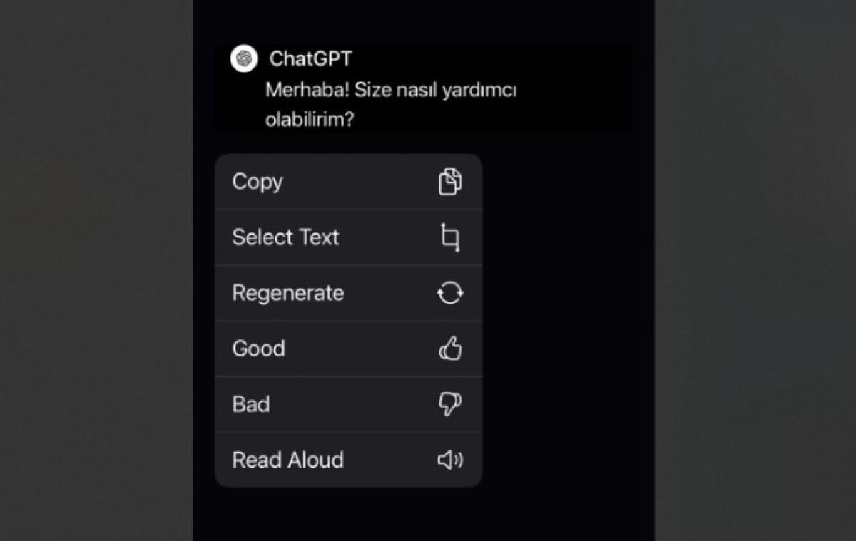 ChatGPT'nin mobil uygulamalarında özelliği aktif etmek istiyorsanız, uygulamanın size verdiği herhangi bir yanıta basılı tutun ve "Read Aloud" seçeneğine dokunun.