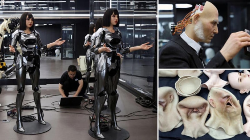 Ex-Robots fabrikasının içinden çekilen korkunç görüntüler, dünyanın en karmaşık robotik ürün sınıfını inşa etmeye çalışan işçilerin etrafını parçalanmış kafalar, boyun uzunluğunda silikon maskeler ve yedek uzuvlarla çevrelenmiş halde gösteriyor.
