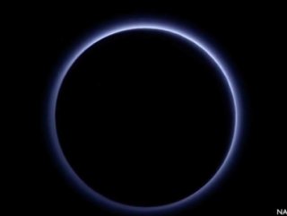 Fotoğraf, Plüton'un atmosferindeki sıradışı maviyi gösteriyor. Bilim insanları bu fenomene neden olan şeyden emin değiller ancak rengin, güneş ışığının gezegenin atmosferinde metana isabet etmesiyle kırılarak ortaya çıktığına inanıyorlar.