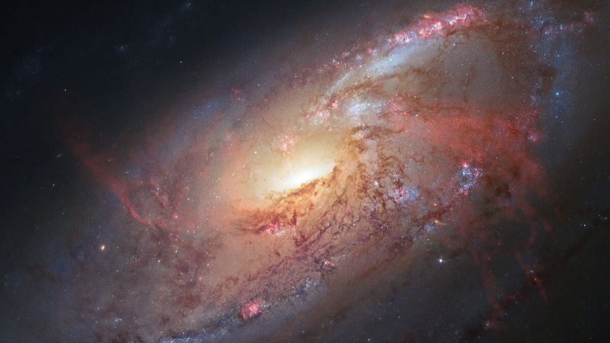 Fotoğrafta galaksinin sarmal kolları, gaz demetleri, yıldızları ve merkezindeki parlak kırmızı gaz akışları açıkça görülebiliyor.