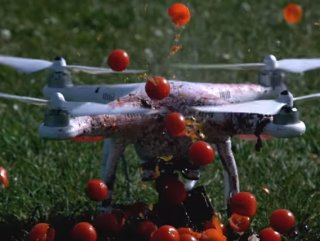 Görüntülerde, blender olarak kullanılan drone'da birçok meyve, sebze ve yumurtanın parçalandığı görülüyor.