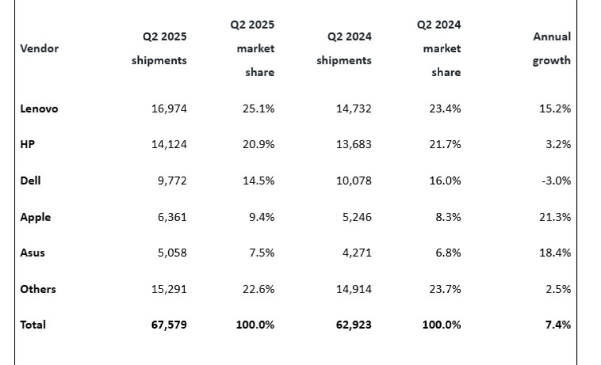 Araştırma şirketi Canalys'in son verilerine göre, küresel PC sevkiyatları 2025 yılının ikinci çeyreğinde, yıllık bazda yüzde 7,4 artarak 67,6 milyon adede ulaştı.