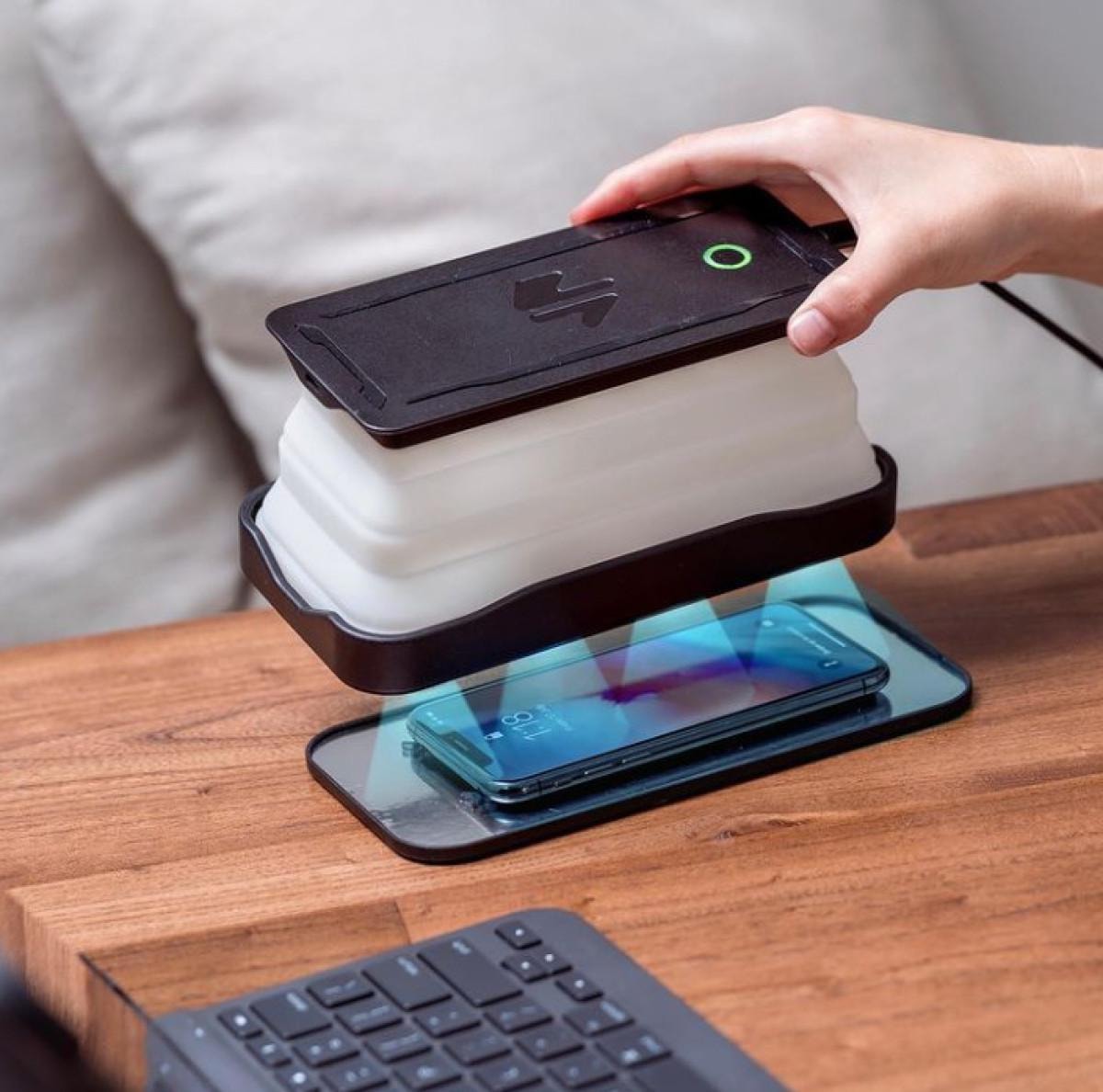 Telefonlarımızı toplu taşımadan banyoya, mutfağa kadar her yere götürüyoruz. Bu şarj cihazını kablosuz olduğu için her yere götürebilirsiniz ve hatta cihazlarınızı dezenfekte edebilir.