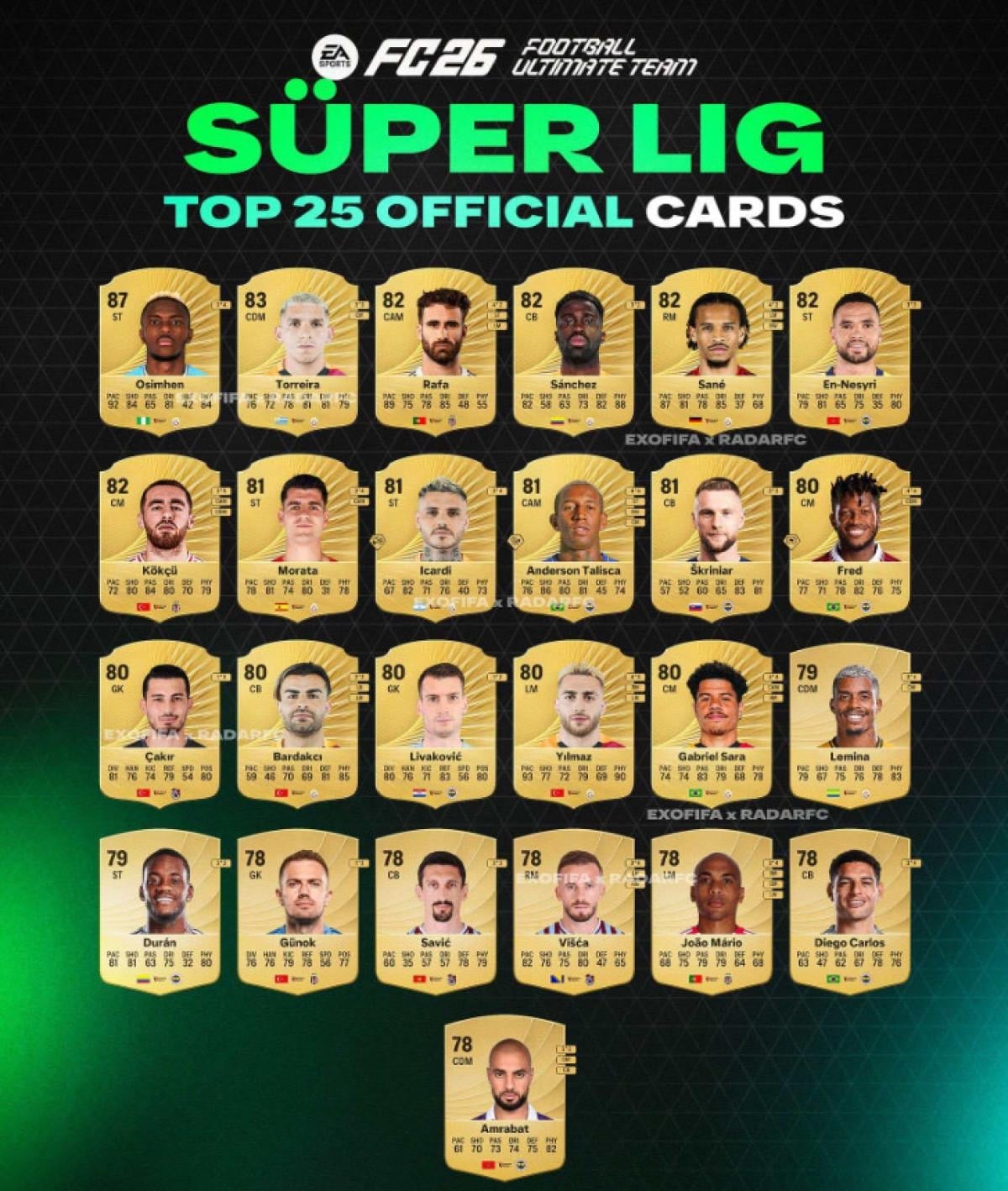 Listenin zirvesinde, 87 reyting ile Galatasaray forması giyen Victor Osimhen yer alıyor. Onu 83 reytingle yine Galatasaray'dan Lucas Torreira ve 82 reytingle Rafa Silva takip ediyor.