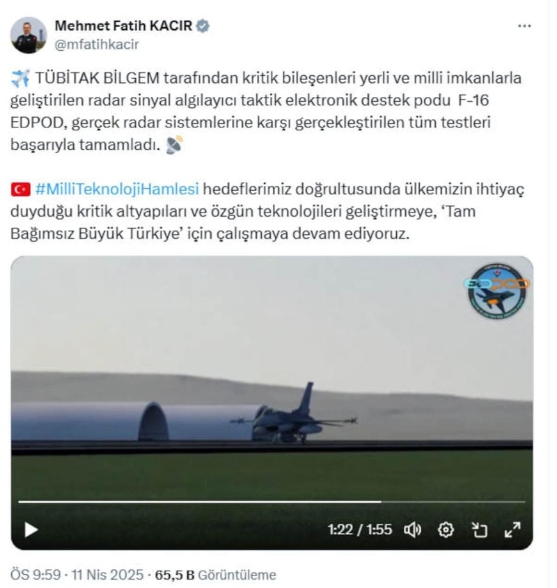 Sanayi ve Teknoloji Bakanı Mehmet Fatih Kacır, sosyal medya hesabı üzerinden yaptığı açıklamada, TÜBİTAK BİLGEM tarafından yerli ve milli imkanlarla geliştirilen radar sinyal algılayıcı taktik elektronik destek podu F-16 EDPOD'un, gerçek radar sistemlerine karşı yapılan tüm testleri başarıyla geçtiğini belirtti. Bakan Kacır, "Milli teknoloji hamlesi doğrultusunda ülkemizin ihtiyaç duyduğu kritik altyapıları ve özgün teknolojileri geliştirmeye devam ediyoruz. Tam bağımsız büyük Türkiye hedefiyle çalışmalarımıza hız kesmeden devam ediyoruz" ifadelerini kullandı.