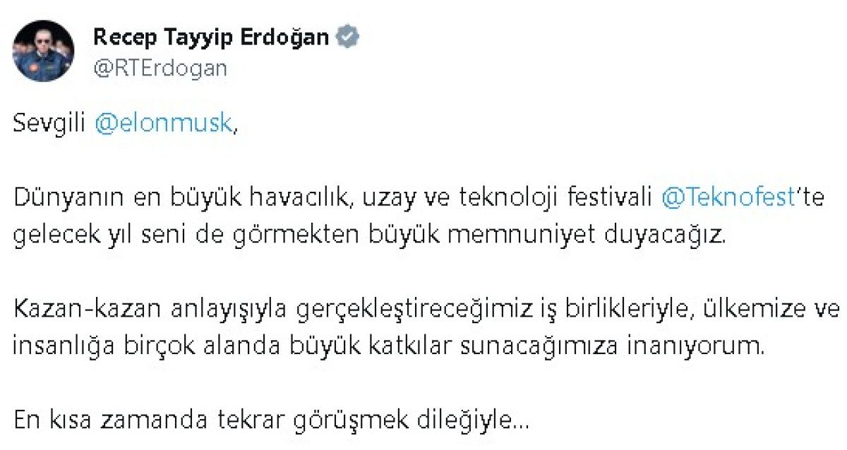 Musk, kendisini TEKNOFEST'e davet eden Cumhurbaşkanı Recep Tayyip Erdoğan'a teşekkür ederek, "Gelecek yıl TEKNOFEST'e bizzat katılmayı ve Türkiye'deki yatırım fırsatlarını görüşmeyi dört gözle bekliyorum." ifadesini kullandı.