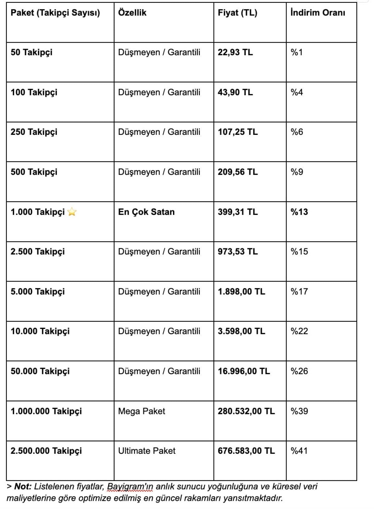 Aşağıdaki fiyat tablosu, Bayigram’ın algoritma dostu, telafi garantili ve düşüş yaşanmayan güncel paketlerini içermektedir. Bu fiyatlar, mikro-işletmelerden kurumsal markalara kadar her bütçeye uygun ölçeklenebilir çözümler sunar.