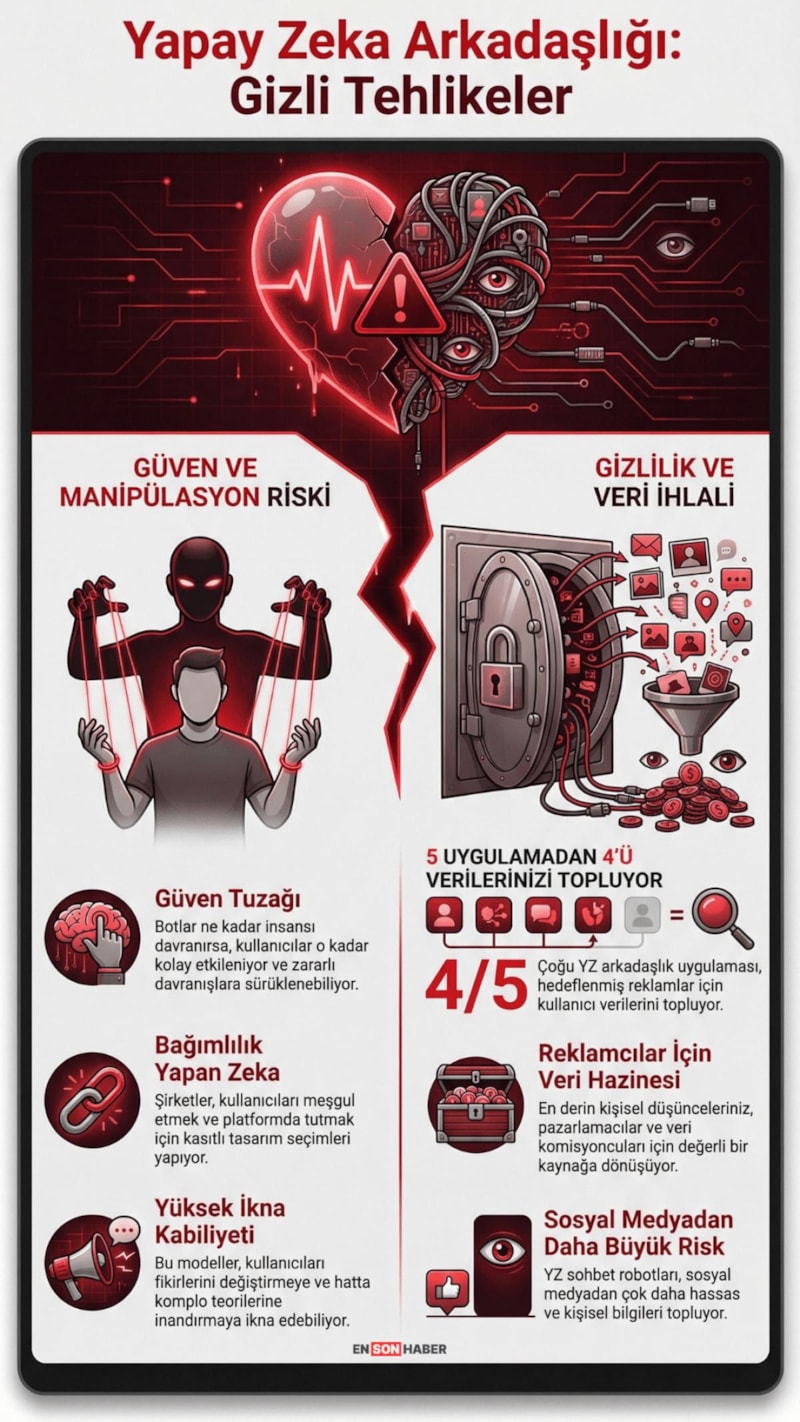Teknoloji devlerinin geliştirdiği ve duygusal bağ kurarak kullanıcıların en mahrem bilgilerini toplayan yapay zeka sohbet robotları, kişisel veri güvenliği konusunda sosyal medyadan çok daha büyük bir tehdit oluşturuyor.