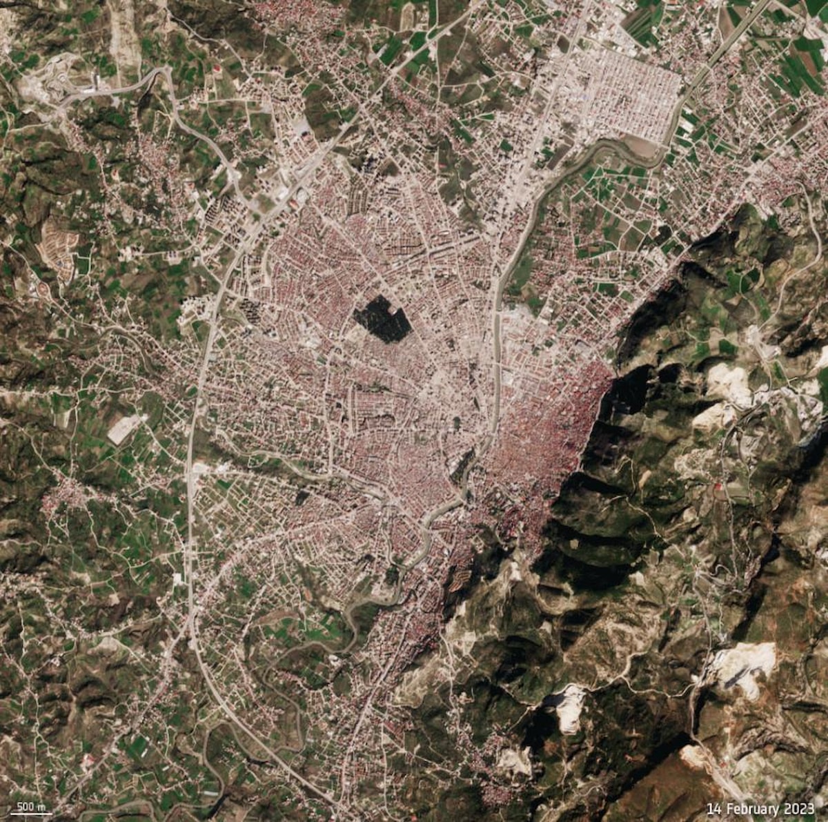 Avrupa Uzay Ajansı (ESA) tarafından işletilen Copernicus Sentinel-2 Dünya gözlem uydusu, merkez Antakya ilçesini uzaydan görüntüledi.