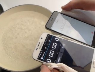 Görüntülerde içerisinde kaynar su olan bir tavaya, suya Galaxy S6 ve iPhone 6 birlikte atılıyor. İki telefonun da suya atılmasından 10 saniye sonra iPhone 6'nın ekranında bir kararma oluyor ve telefon kapanıyor.